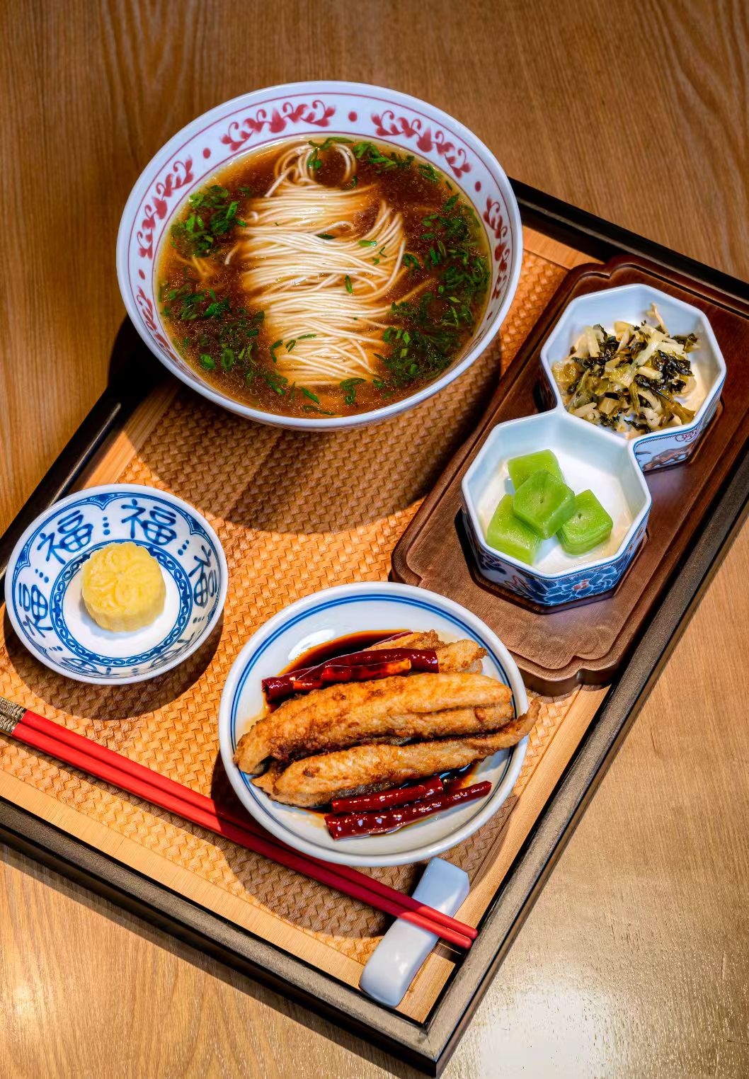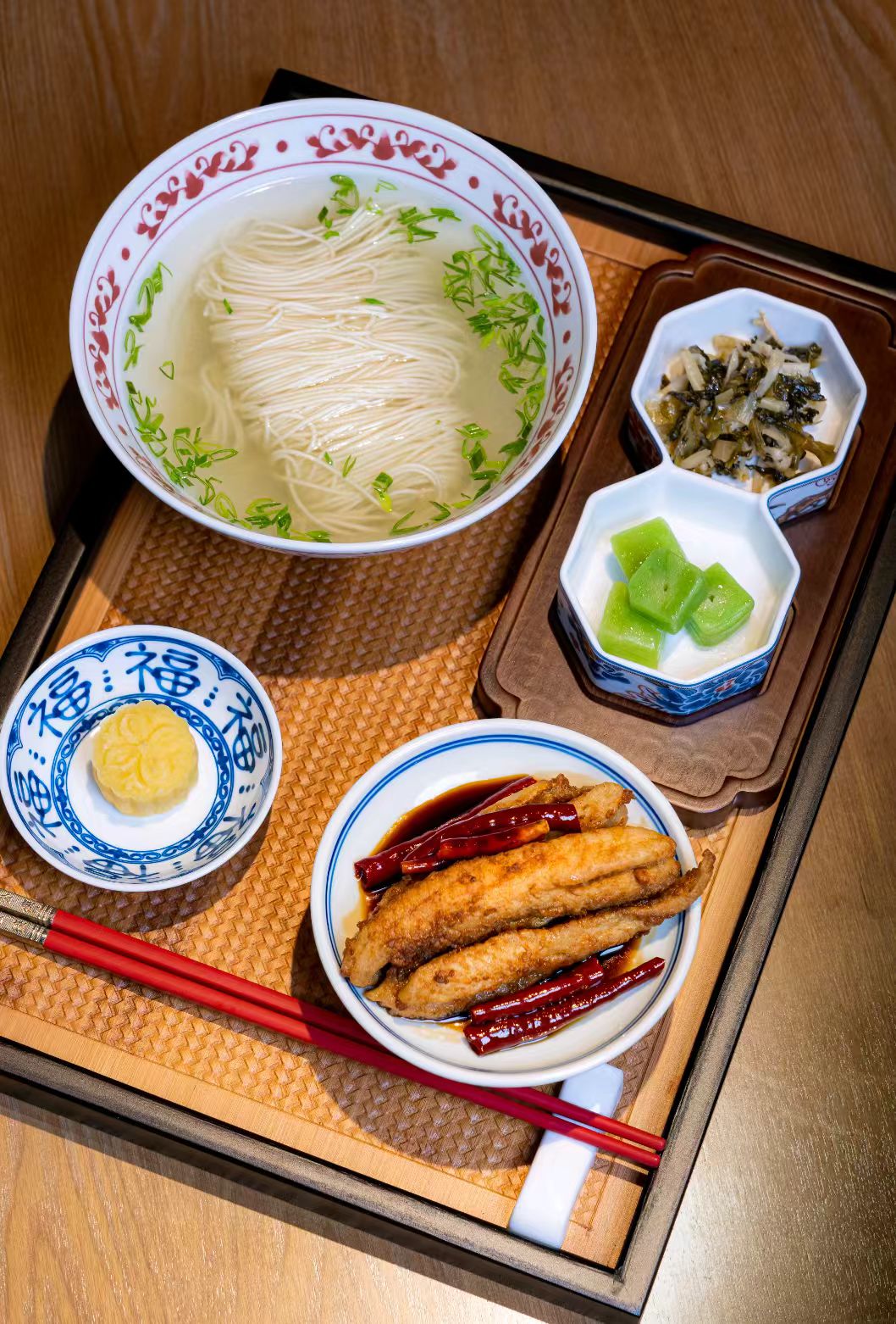 “筠面坊”特推出招牌香酥黄鱼面套餐,含香酥黄鱼浇头一份、红汤面或白汤面一碗、开胃菜两碟、绿豆糕一块。其中香酥黄鱼浇头选用了酒店“新味阁”中餐厅招牌菜之一“满江红香酥黄鱼”,精选东海黄花鱼,每条三两左右,背部开刀,拍脆浆粉炸至金黄,二荆条和干辣椒炒香淋上秘制酱汁外酥里嫩,松脆可口。