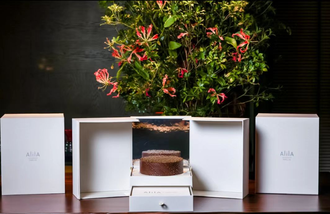 黑金鱼子酱蛋糕,是奢华与创新的化身。九年鱼子酱的琥珀色爆珠遇上黑巧,瞬间在舌尖上奏响华丽乐章;香脆榛子与西班牙 5J 火腿交织出丰富层次,法国酸樱桃冻的酸甜更是巧妙平衡了整体口感。