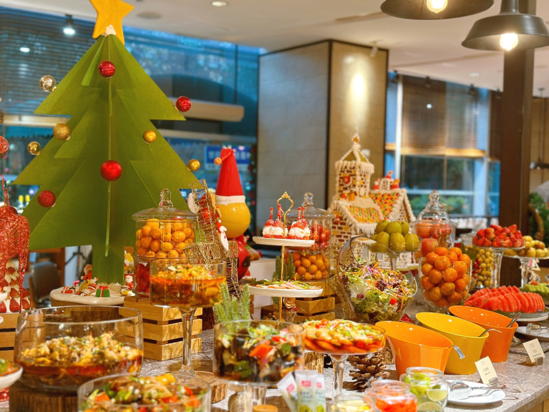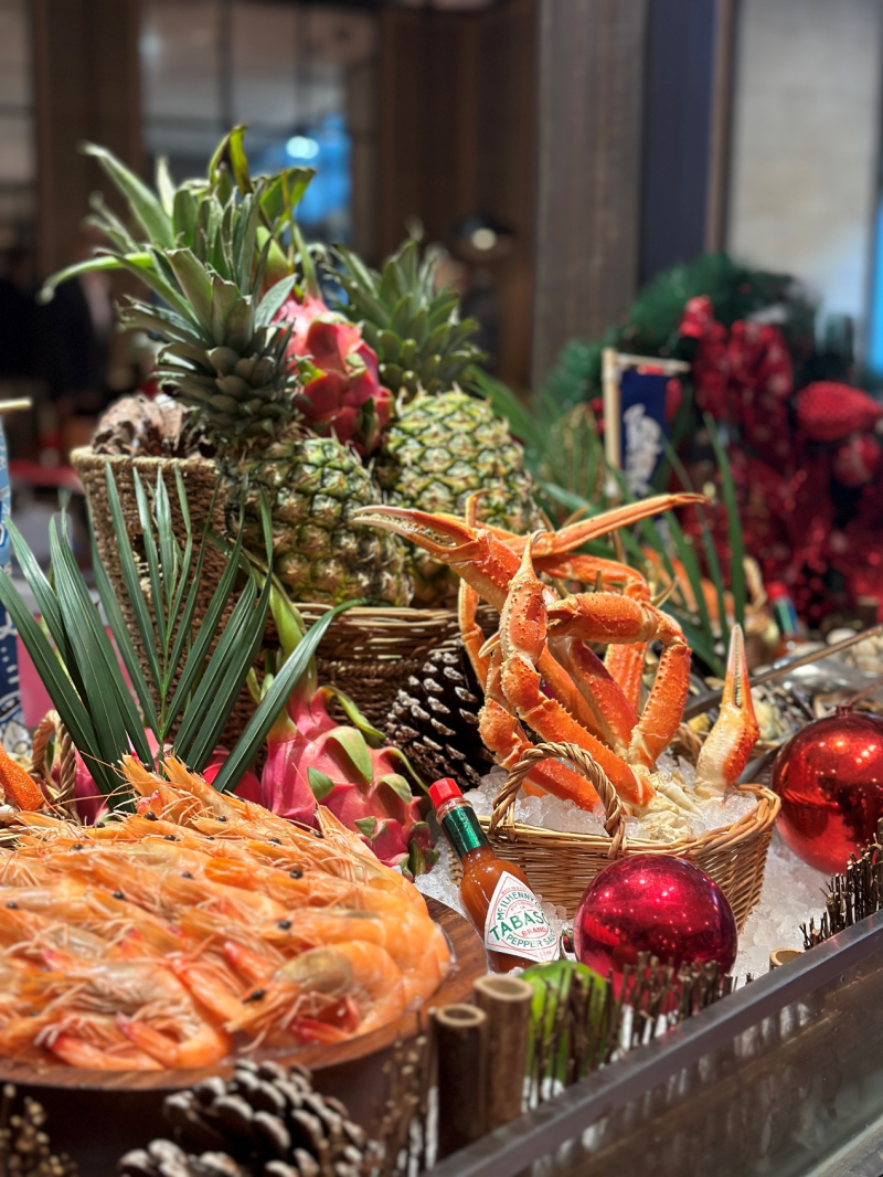 圣诞晚宴精彩绝伦,构成一幅完整的味觉世界地图。海鲜盛宴吧:陈列着包括生蚝、帝王蟹腿、翡翠螺在内的各式进口冰鲜海产,供宾客无限畅享。亚洲及中式佳肴:考虑到本地宾客的多元口味,晚餐亦精心准备了多款精选中式热菜及亚洲特色料理。梦幻甜品王国:圣诞主题的甜品台树根蛋糕、圣诞布丁、各式法式甜点与手工巧克力,构筑甜蜜的收官之笔。